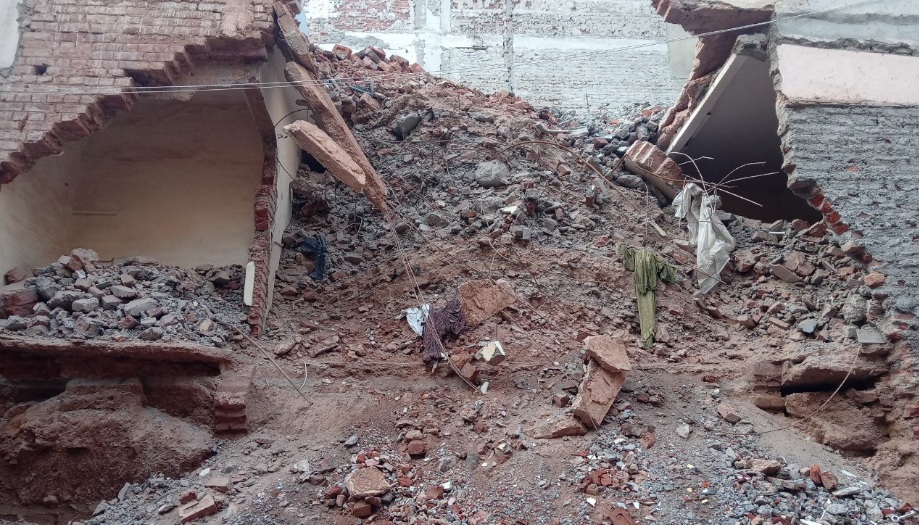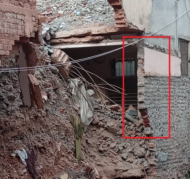 7. The upper slab was cut/ dismantled without any support leading to excess load on the non load bearing wall, which broke away from top of the building. All the debris (Malwa) accumulated on top of slab and along the wall also caved in.